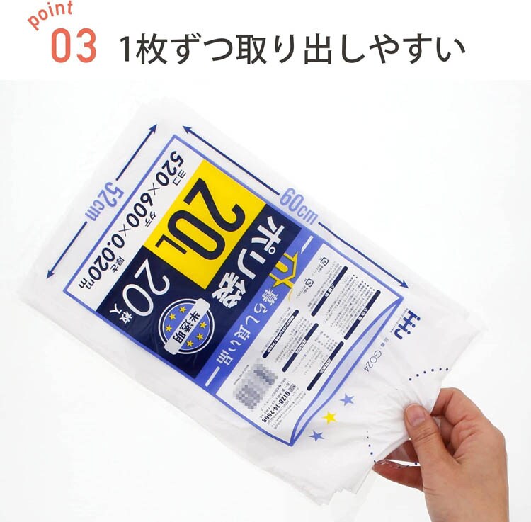 | ・サイズ:約52×60cm(1枚あたり) ・厚み:0.02mm ・容量:20L ・カラー:半透明 ・枚数:20枚 ・材質:低密度ポリエチレン(LLDPE) |