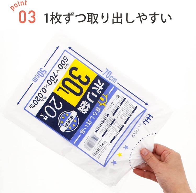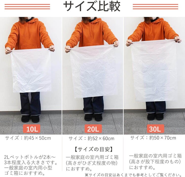 | ・サイズ:約50×70cm(1枚あたり) ・厚み:0.02mm ・容量:30L ・カラー:半透明 ・枚数:20枚 ・材質:低密度ポリエチレン(LLDPE) |