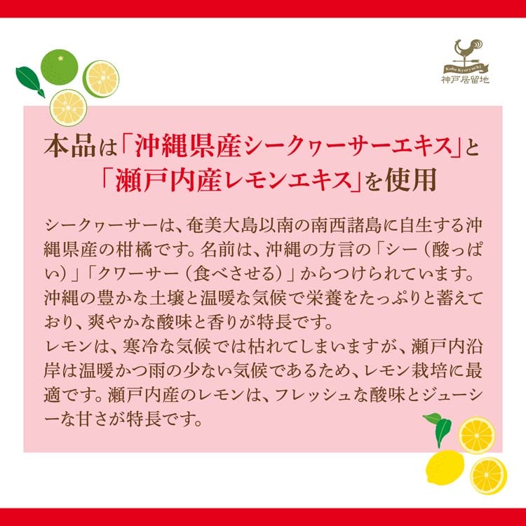 本品は「沖縄県産シークヮーサーエキス」と「瀬戸内産レモンエキス」を使用。