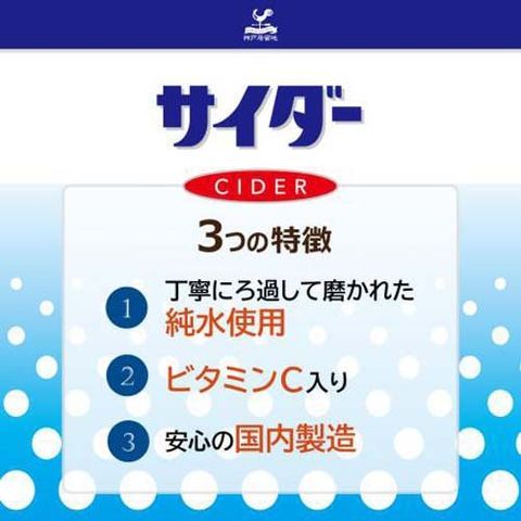 ●シンプルなサイダーだからこそ水にもこだわり、丁寧に濾過を重ねて磨き上げた純水を使用しています。爽快な飲み心地を楽しめる炭酸飲料です。飲みきりにピッタリな250mlサイズ。ビタミンC入り。安心の国内製造。