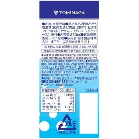 | 100mlあたり エネルギー:19kcal、たんぱく質:0g、脂質:0g、炭水化物:5g、食塩相当量:0.02g、ビタミンC:8mg |