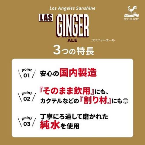 ●LAS(Los Angeles Sunshine.)シリーズは商品特徴カリフォルニアのきらめく陽光をイメージした商品です。丁寧にろ過して磨かれた純水を使用しています。スパイシーな味わいのなかにすっきりとした甘さのバランスが良いジンジャーエールです。安心の国内製造。