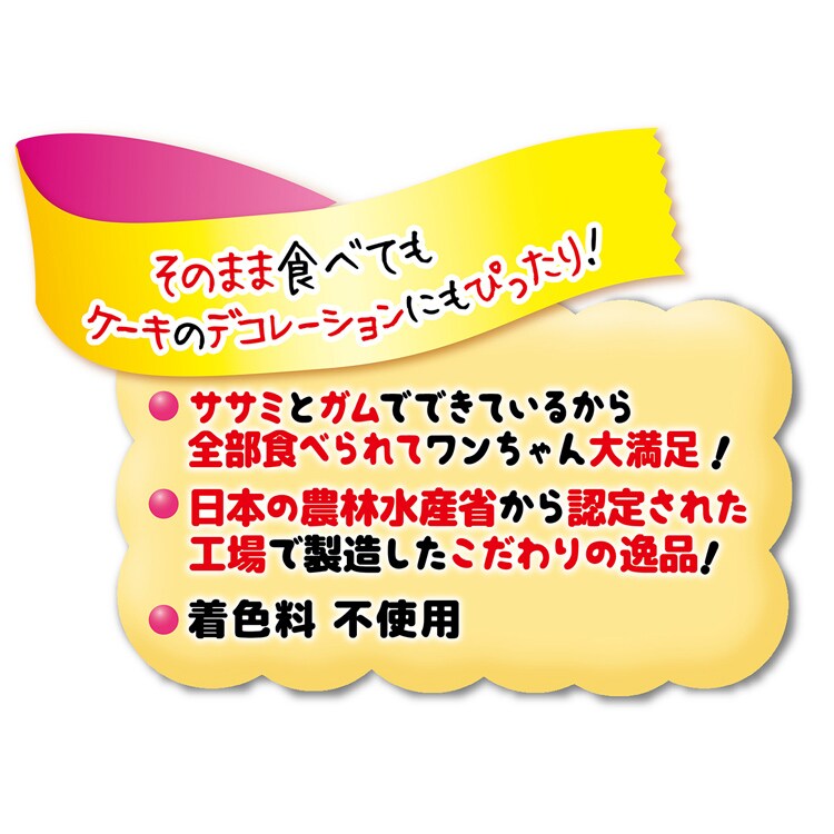 | 鶏ササミ、牛皮、でんぷん類、グリセリン、ソルビトール、保存料(ソルビン酸K) |