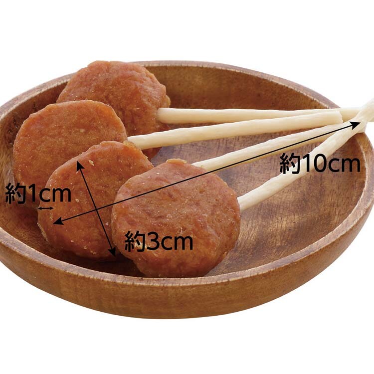 | 肉類(鶏ササミ・鶏レバー)、牛皮、でんぷん類、エンドウたん白、食塩、グリセリン、ソルビトール、保存料(ソルビン酸K)、酸化防止剤(エリソルビン酸Na)、発色剤(亜硝酸Na) |