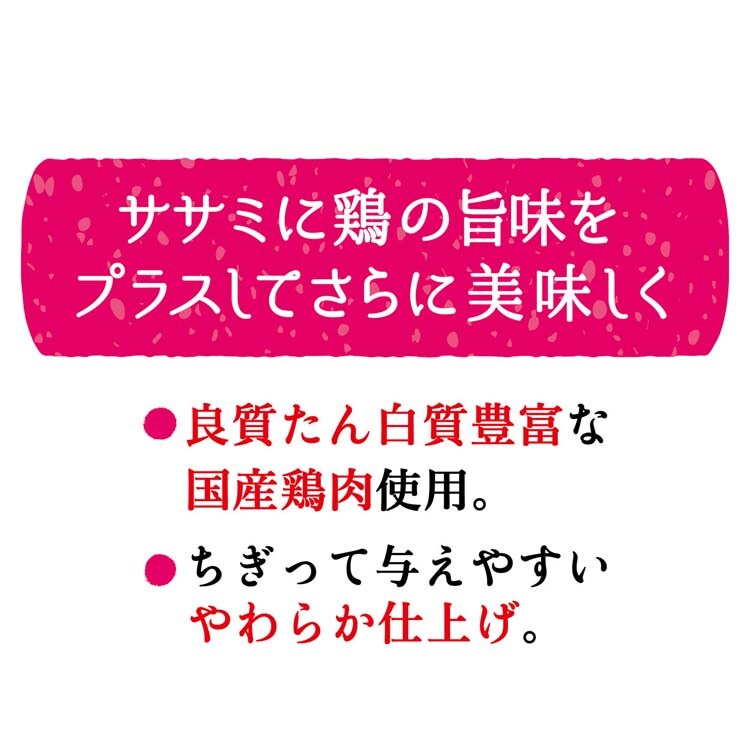 | 肉類(鶏・鶏ササミ)、小麦粉、植物性油脂、酵母エキス、チキンエキス、ソルビトール、加工でんぷん、グリセリン、リン酸塩(Na)、カゼインNa、着色料(β-カロテン・紅麹) |