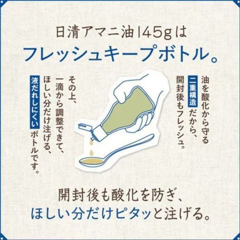 ●フレッシュキープボトルだから開封後も油を酸化から守り、ほしい分だけピタッと注げます。