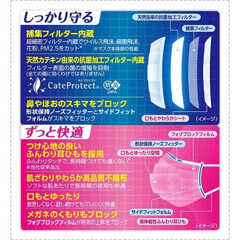 | ・こどもサイズ(マスク幅125mm) 本体部:ポリプロピレン、ポリエチレン、ポリエステル 耳ひも部:ポリエステル、ポリウレタン ノーズフィッター:鉄、ポリプロピレン |