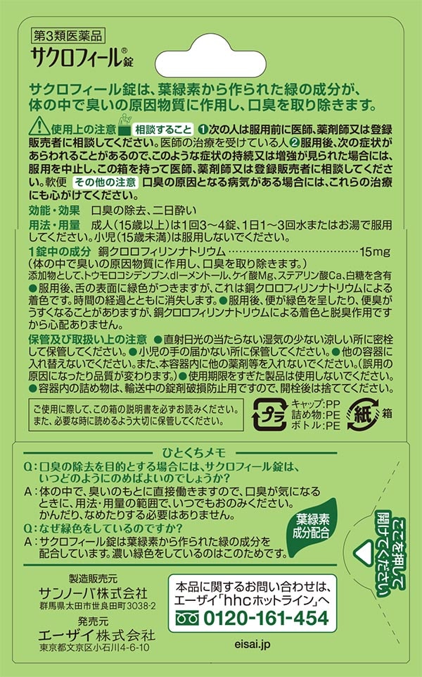 | (1錠中) 銅クロロフィリンナトリウム:15mg 添加物として、トウモロコシデンプン、dL-メントール、けい酸Mg、ステアリン酸Ca、白糖を含有 ※服用後、舌の表面に緑色がつきますが、これは銅クロロフィリンナトリウムによる着色です。時間の経過とともに消失します。 ※服用後、便が緑色を呈したり、便臭がうすくなることがありますが、銅クロロフィリンナトリウムによる着色と脱臭作用ですから心配ありません。 |