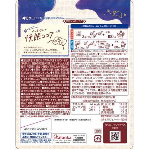 | 1杯20g当たり エネルギー:74kcal、たんぱく質:1.2g、脂質:2.6g、炭水化物:14.9g(糖質:10.8g、食物繊維:4.1g)、食塩相当量:0.1g 機能性関与成分:GABA 100mg カカオポリフェノール:160mg |