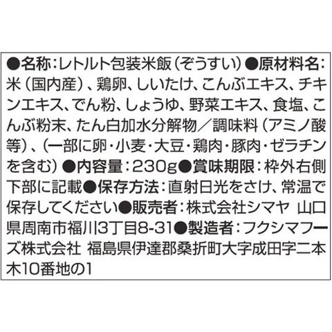 米(国内産)、鶏卵、しいたけ、こんぶエキス、チキンエキス、でん粉、しょうゆ、野菜エキス、食塩、こんぶ粉末、たん白加水分解物/調味料(アミノ酸等)、(一部に卵・小麦・大豆・鶏肉・豚肉・ゼラチンを含む)