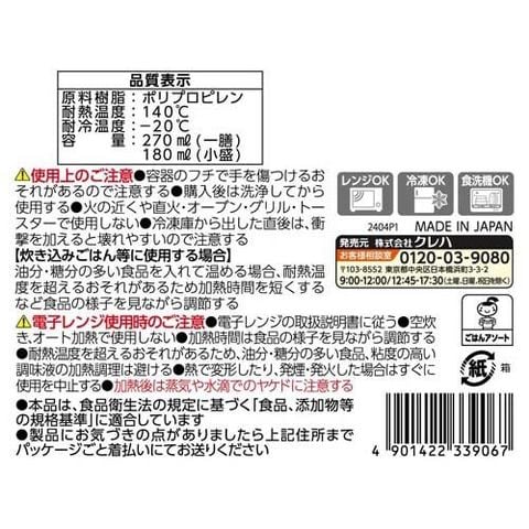 (加熱時間の目安)・ごはん150g→600W:2分30秒・500W:3分 ・ごはん100g→600W:1分50秒・500W:2分10秒