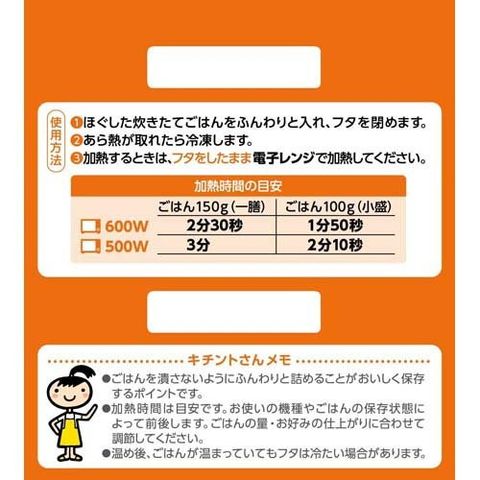 (使用方法)(1)ほぐした炊きたてごはんをふんわりと入れ、フタを閉めます。(2)あら熱が取れたら冷凍します。(3)加熱するときは、フタをしたまま電子レンジで加熱してください。