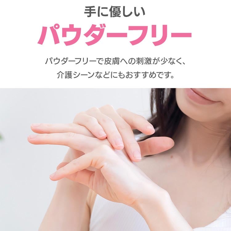 パウダーフリーで皮膚への刺激が少なく、介護シーンなどにもおすすめです。