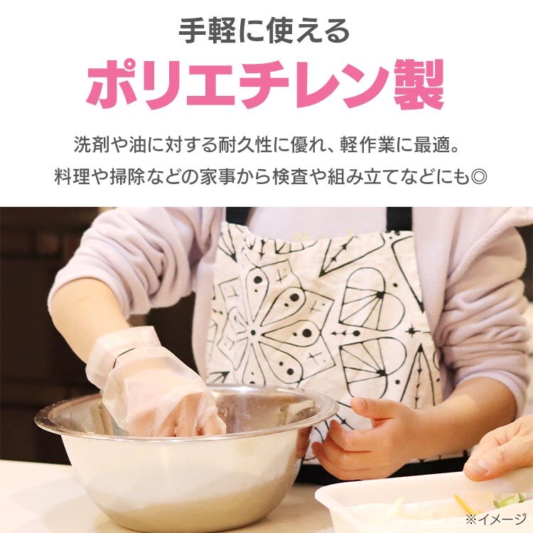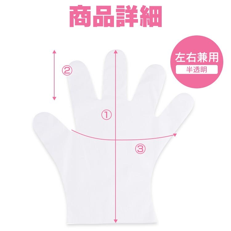 | ・左右兼用 半透明 ・サイズ(mm) 全長 Lサイズ:270 手周囲 Lサイズ:284 中指長 Lサイズ:92 ※寸法表示は参考値で、着用時の寸法は伸縮により異なります。 ・材質 ポリエチレン |