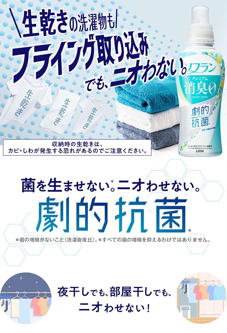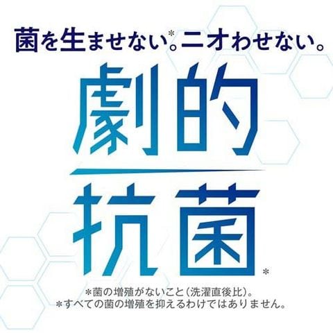 ●繊維のすみずみまで、極小消臭成分+抗菌成分が吸着。ソフランの抗菌力で、生乾きでも菌を生ませず※1、ニオわせない。汗臭・体臭・生乾き臭・加齢臭・靴下臭も0へ。