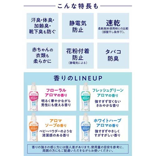 ●繊維のすみずみまで、極小消臭成分+抗菌成分が吸着。ソフランの抗菌力で、生乾きでも菌を生ませず※1、ニオわせない。汗臭・体臭・生乾き臭・加齢臭・靴下臭も0へ。
