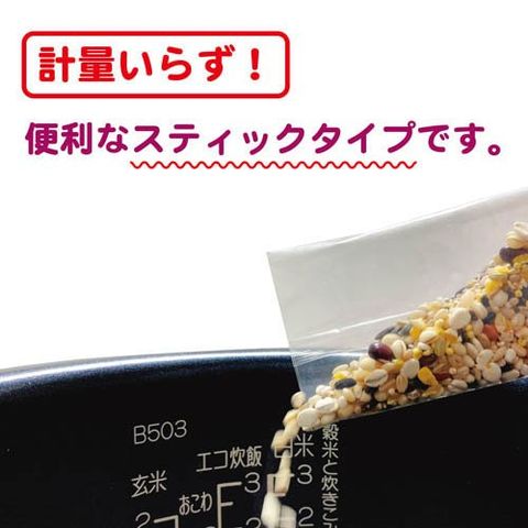 | 丸麦(大麦(国産))、黒米、胚芽押麦、もち麦、大豆、米粒麦、もち玄米、発芽玄米、青肌玄米、青大豆、黒大豆、もちきび、緑米、もちあわ、アマランサス、とうもろこし |