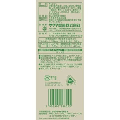 | 各味1粒3.5g当たり エネルギー:15kcal、タンパク質:0.044g、脂質:0.21g、炭水化物:3.2g、食塩相当量0.0016g、ビタミンC4.2mg |