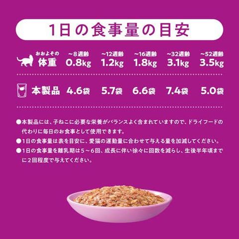 ~8週齢(おおよその体重0.8kg):4.6袋、~12週齢(おおよその体重1.2kg):5.7袋、~16週齢(おおよその体重1.8kg):6.6袋、~32週齢(おおよその体重3.1kg):7.4袋、~52週齢(おおよその体重3.5kg):5.0袋