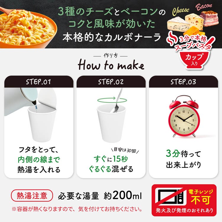 | パスタ(ベルギー製造)、チーズパウダー、デキストリン、クリーミン グパウダー、でん粉、食塩、乾燥ベーコン、食用加工油脂、鶏卵加工品 、チキンエキス、酵母エキス、砂糖、香辛料、ポークエキス、バター風味パウダー、食用油脂/キサンタンガム、調味料(アミノ酸等)、クチナシ色素、酸味料、香料、酸化防止剤(ビタミンE、ローズマリー抽出物)、(一部に小麦・卵・乳成分・大豆・鶏肉・豚肉を含む) |