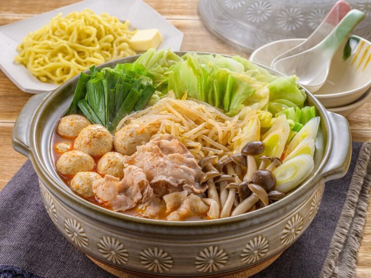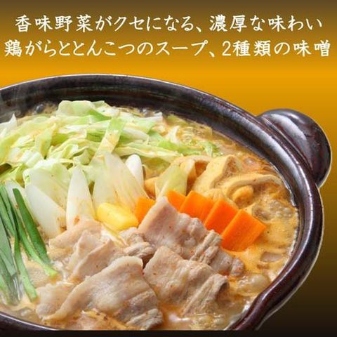 ●鶏ガラととんこつのスープに、米みそと豆みそをあわせた、コクがあって濃厚な味わいの、濃厚みそ鍋つゆです。