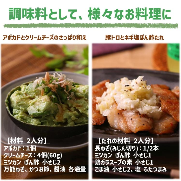 ●醤油やだし等を加えることにより、オリジナルの味付けぽん酢をお作りいただけます。また、ドレッシングや浅漬けのベース等、様々な調味液にアレンジいただけます。
