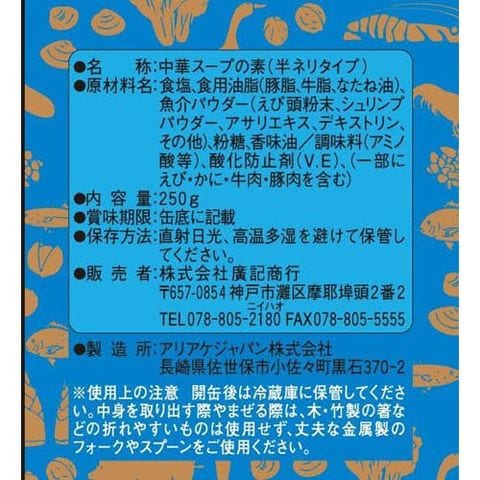 食塩(国内製造)、食用油脂(豚脂、牛脂、なたね油)、魚介パウダー(えび頭粉末、シュリンプパウダー、アサリエキス、デキストリン、その他)、粉糖、香味油/調味料(アミノ酸等)、酸化防止剤(V.E)、(一部にえび・かに・牛肉・豚肉を含む)