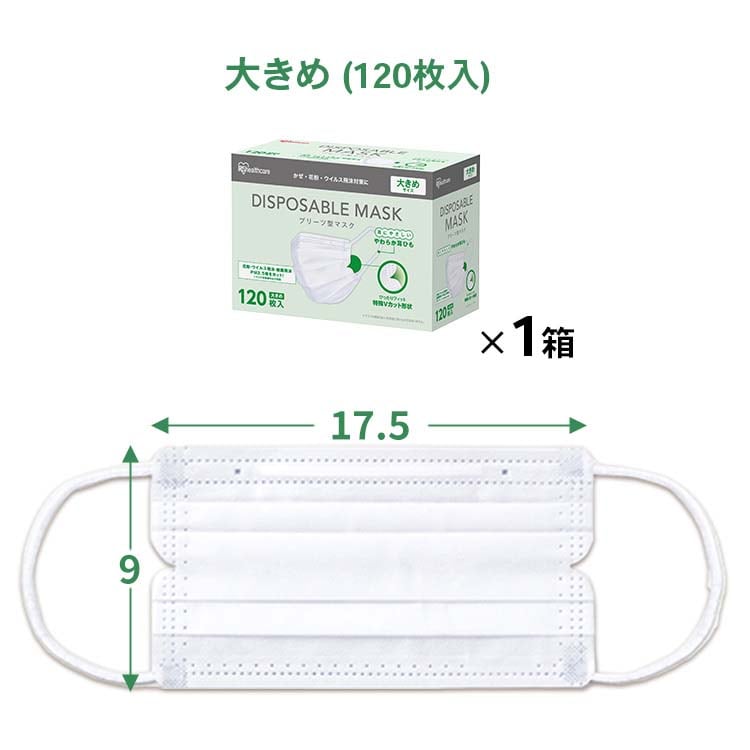 | ふつうサイズ:120枚×1箱セット 商品サイズ(cm):幅約16.5×高さ約9 主要材質 本体・フィルター:ポリプロピレン 耳ひも:ポリウレタン、ポリエステル ノーズフィッター:ポリエチレン |