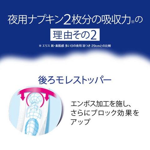 ●夜用ナプキン2枚分(※1)の吸収力で、多い日の夜もモレ不安0へ。