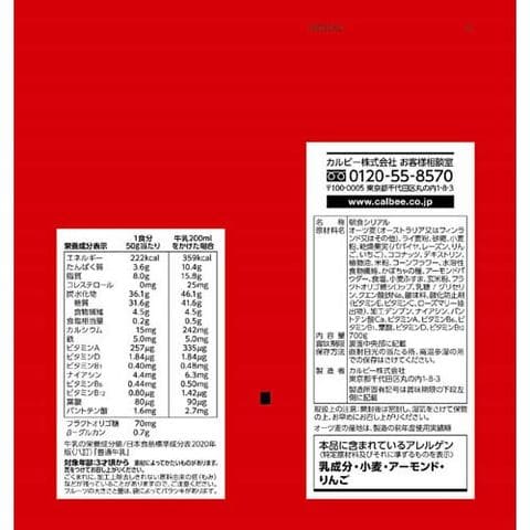| オーツ麦(オーストラリア又はフィンランド又はその他)、ライ麦粉、砂糖、小麦粉、乾燥果実(パパイヤ、レーズン、りんご、いちご)、ココナッツ、デキストリン、植物油、米粉、コーンフラワー、水溶性食物繊維、かぼちゃの種、アーモンドパウダー、食塩、小麦ふすま、玄米粉、フラクトオリゴ糖シロップ、乳糖 / グリセリン、クエン酸鉄Na、酸味料、酸化防止剤(ビタミンE、ビタミンC、ローズマリー抽出物)、加工デンプン、ナイアシン、パントテン酸Ca、ビタミンA、ビタミンB6、ビタミンB1、葉酸、ビタミンD、ビタミンB12 |