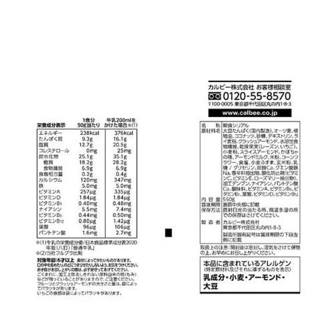 | 大豆たんぱく(国内製造)、オーツ麦、植物油、ココナッツ、砂糖、デキストリン、ライ麦粉、クラッシュアーモンド、水溶性食物繊維、乾燥果実(レーズン、いちご)、小麦粉、スライスアーモンド、かぼちゃの種、アーモンドミルク、米粉、コーンフラワー、食塩、小麦ふすま、玄米粉、乳糖 / グリセリン、炭酸Ca、クエン酸鉄Na、香辛料抽出物、酸化防止剤(ビタミンC、ビタミンE、ローズマリー抽出物)、加工デンプン、ナイアシン、パントテン酸Ca、酸味料、ビタミンA、ビタミンB6、ビタミンB1、葉酸、ビタミンD、ビタミンB12 |