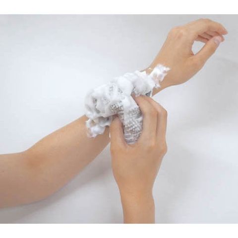 ●身体を洗って髪を結べる、のびのびシュシュ形状の2WAYボディタオルです。