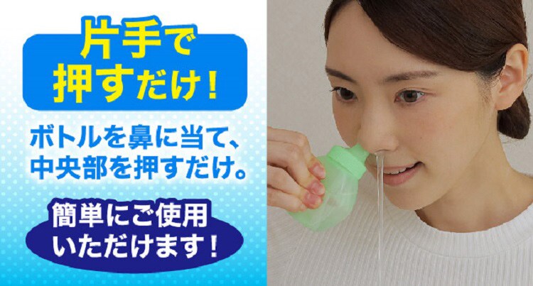 図のように少し下を向き、ボトル本体の中央部を押して洗浄液を鼻の中に流し込み、左右の鼻を洗浄してください