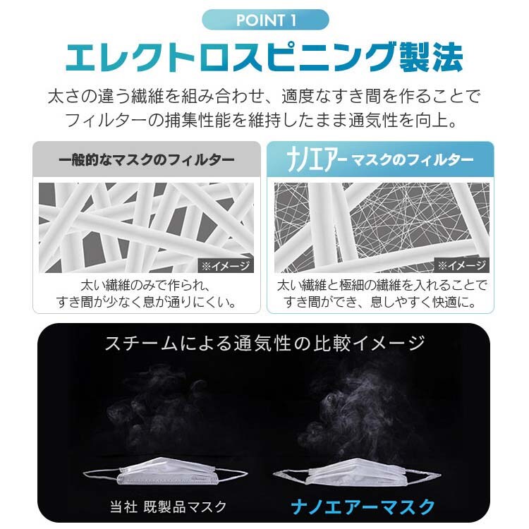 ●ナノファイバー加工の中間層を採用し、通気性を保ちながらウイルス飛沫の侵入を防ぐ。