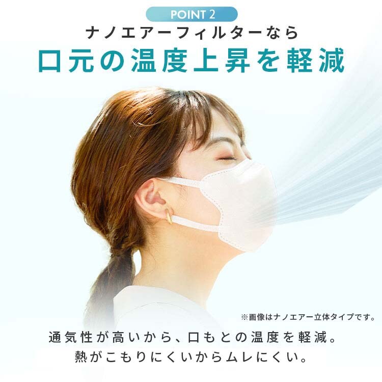 ●特殊ナノファイバー加工の中間層が着用時の口元温度上昇を緩和し、蒸れによる不快感を軽減。