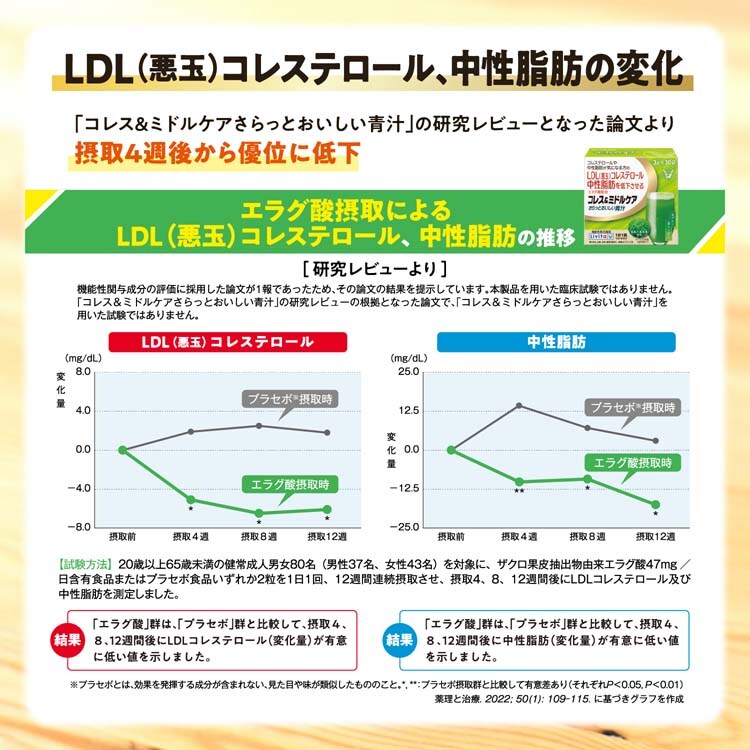 届出表示:本品には、エラグ酸が含まれます。エラグ酸には、LDL(悪玉)コレステロールや中性脂肪を低下させる機能があることが報告されています。