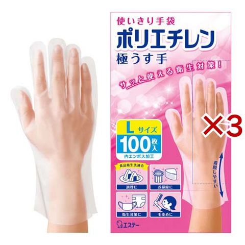 使いきり手袋 ポリエチレン 極うす手 料理 掃除用 Lサイズ 半透明 (100枚入×3セット)