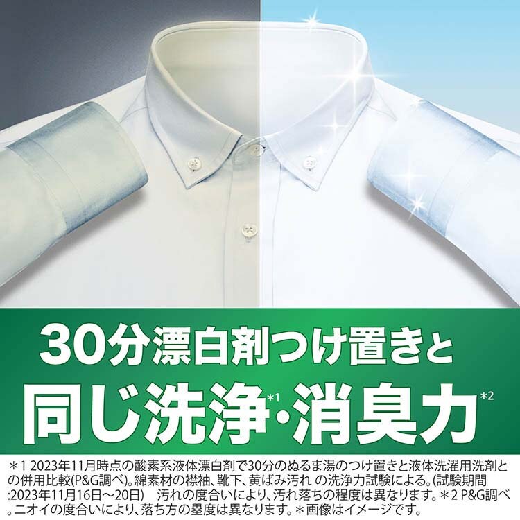 (1)汚れ・ニオイの蓄積を防ぐ。(2)綿素材の襟袖、靴下、黄ばみ汚れの洗浄力試験による。汚れの度合いにより、汚れ落ちの程度は異なります。(3)全ての菌の増殖を抑えるわけではありません。(4)静電気を防ぐ効果による。すすぎ1回の場合。繰り返し洗濯することで効果を発揮します。すべての花粉・ハウスダストを防ぐわけではございません。