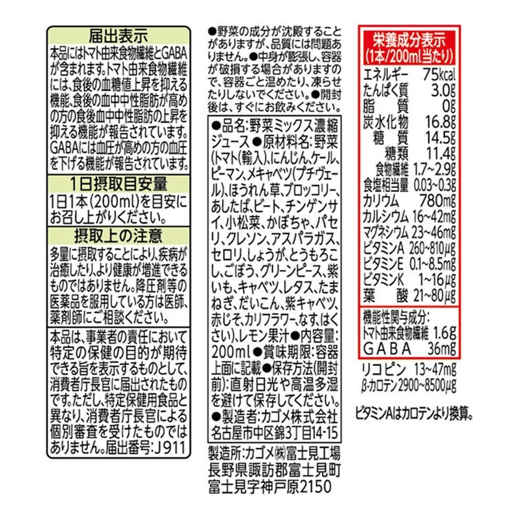 | 1本(200ml)当たり エネルギー:75kcal、たんぱく質:3.0g、脂質:0g、炭水化物:16.8g(糖質:14.5g、糖類:11.4g、食物繊維:1.7 ~2.9g)、食塩相当量:0.03 ~0.3g、カリウム:780mg、カルシウム:16 ~42mg、マグネシウム:23 ~46mg、ビタミンA:260 ~810μg、ビタミンE:0.1 ~8.5mg、ビタミンK:1 ~16μg、葉酸:21 ~80μg、機能性関与成分:トマト由来食物繊維 1.6g、GABA:36mg、リコピン:13 ~47mg、β-カロテン:2900 ~8500μg |