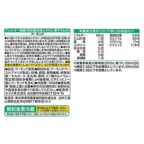 | コップ1杯(200g)当たり エネルギー:60kcal、たんぱく質:1.3g、脂質:4.0g、コレステロール:0mg、炭水化物:5.2g(糖質:4.1g、糖類:3.6g、食物繊維:1.1g)、食塩相当量:0.42g、カルシウム:60mg、マグネシウム:17mg、ビタミンE:11.9mg |