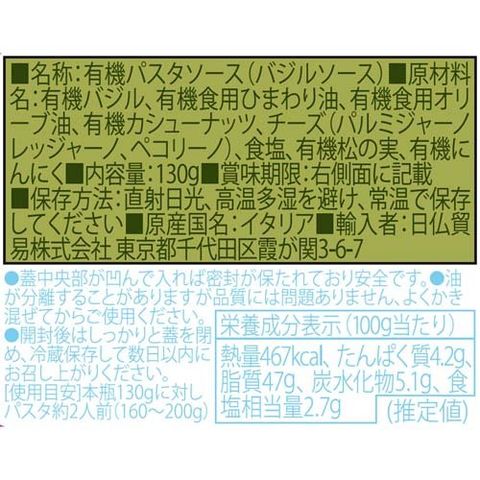 | 有機バジル、有機食用ひまわり油、有機食用オリーブ油、有機カシューナッツ、チーズ(パルミジャーノレッジャーノ、ペコリーノ)、食塩、有機松の実、有機にんにく |