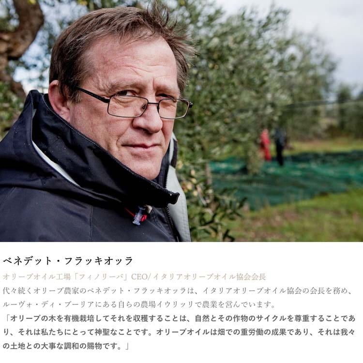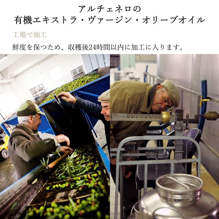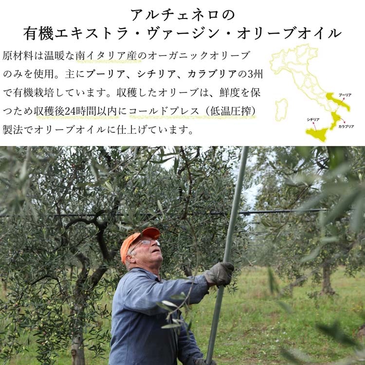 ●原材料は温暖な南イタリア産のオーガニックオリーブのみを使用。主にプーリア、シチリア、カラブリアの3州で有機栽培しています。収穫したオリーブは、鮮度を保つため収穫後24時間以内にコールドプレス(低温圧搾)製法でオリーブオイルに仕上げています。