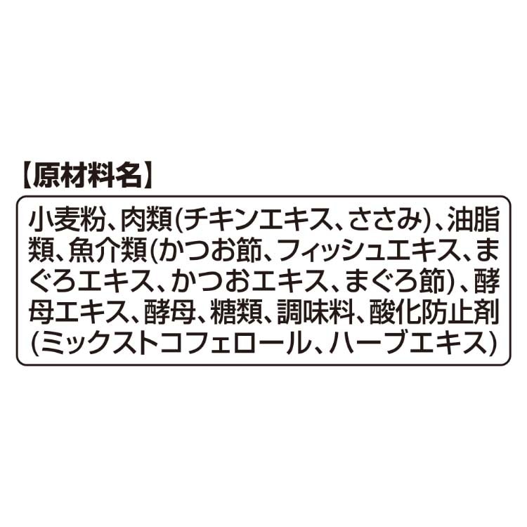 | 小麦粉、肉類(チキンエキス、ささみ)、油脂類、魚介類(かつお節、フィッシュエキス、まぐろエキス、かつおエキス、まぐろ節)、酵母エキス、酵母、糖類、調味料、酸化防止剤(ミックストコフェロール、ハーブエキス) |