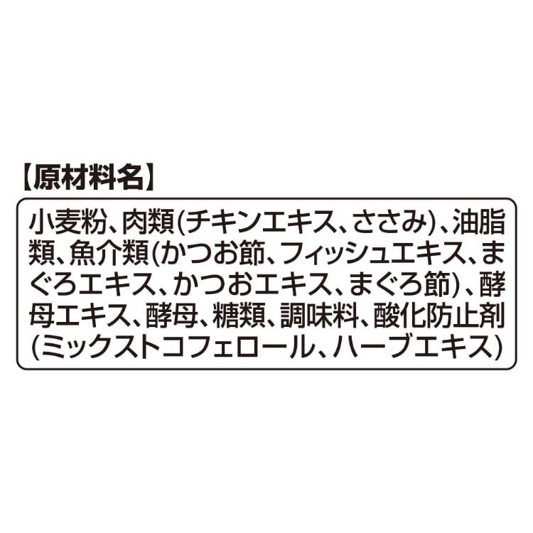 小麦粉、肉類(チキンエキス、ささみ)、油脂類、魚介類(かつお節、フィッシュエキス、まぐろエキス、かつおエキス、まぐろ節)、酵母エキス、酵母、糖類、調味料、酸化防止剤(ミックストコフェロール、ハーブエキス)