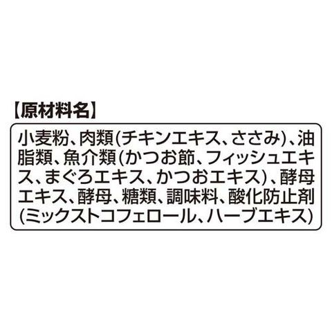 | 小麦粉、肉類(チキンエキス、ささみ)、油脂類、魚介類(かつお節、フィッシュエキス、まぐろエキス、かつおエキス)、酵母エキス、酵母、糖類、調味料、酸化防止剤(ミックストコフェロール、ハーブエキス) |