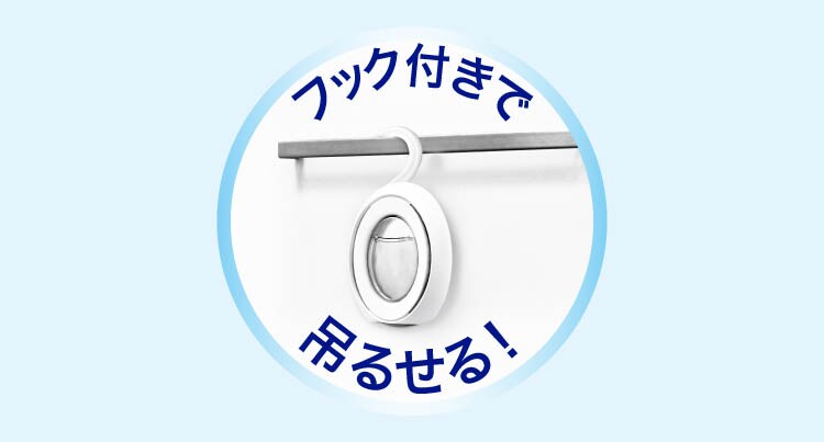 ・使用方法:1.パッケージから製品を取り出し、両方の親指で裏面の水色のボタンをしっかり押し込む。2.浴室内のシャンプーラックや窓枠など平らな安定した場所に置いて使用してください。3.タオルハンガーや物干し竿のように安定した状態で吊るすことができる場所に吊るしてご使用ください。香料が裏側の浸透膜に浸透するため、ボタンがしっかり押されると液面が下がります。香りは徐々に広がる。<1分たっても香りがしない場合>水色のボタンを再度しっかり押す。使用状況により少量の香料が残ることがありますが、香りが弱くなったら、取り換えてください。フックの取り付け方:フックの下部にある楕円と、製品の裏側に開いている楕円の穴(上部の真中)の形が合うように重ね、カチッと音がするまで押し込み、フックが製品の裏側に、完全に装着されたことを確認する。※高温の空気が直接かかるような場所には(浴室乾燥機など)、製品を吊るさないでください。 製品の持続性やフックの品質に影響を及ぼす場合があります。