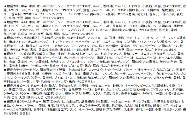 | ★銀座カリー中辛:小麦、乳成分、牛肉、大豆、鶏肉、りんご、ゼラチン ★銀座カリー辛口:小麦、乳成分、牛肉、大豆、鶏肉、豚肉、りんご、ゼラチン ★銀座ハヤシ:小麦、乳成分、牛肉、ごま、大豆、鶏肉、バナナ、りんご、ゼラチン ★銀座キーマ:小麦、乳成分、牛肉、ごま、大豆、鶏肉、豚肉、りんご、ゼラチン ★銀座バターチキン:小麦、乳成分、牛肉、大豆、鶏肉、りんご ★銀座洋食ビーフシチュー:小麦、乳成分、牛肉、ごま、大豆、鶏肉、りんご、ゼラチン ★銀座洋食クリームシチュー:小麦、乳成分、大豆、鶏肉、ゼラチン |