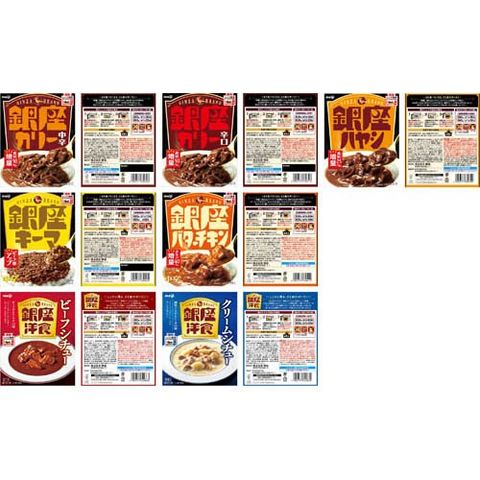 | 銀座カリー中辛:180g×1袋、銀座カリー辛口:180g×1袋、銀座ハヤシ:180g×1袋、銀座キーマ:150g×1袋、銀座カリーバターチキン:180g×1袋、銀座洋食ビーフシチュー:180g×1袋、銀座洋食クリームシチュー:180g×1袋 計7種 7袋 |