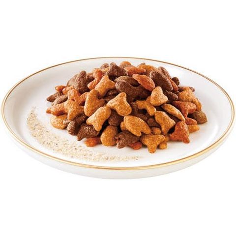 | 穀類(とうもろこし、とうもろこしたんぱく、小麦、米等)、肉類(チキンミール等)、動物性油脂、魚介類(まぐろ、かつお、しらすパウダー)、たんぱく加水分解物、フレーバーブレンド(鯛、かに、チーズ等)、ミネラル類(カルシウム、リン、カリウム、ナトリウム、クロライド、鉄、銅、マンガン、亜鉛、ヨウ素、セレン)、ビタミン類(A、E、K、B1、B2、パントテン酸、ナイアシン、B6、葉酸、ビオチン、B12、コリン)、アミノ酸類(メチオニン、タウリン)、着色料(カラメル色素、カロテノイド色素) |