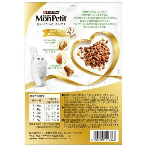(給与方法(目安))猫の体重:1日の量(20g袋換算)2~3kg:1.5-2.25袋 3~4kg:2.25-3袋 4~5kg:3-3.75袋 5~6kg:3.75-4.5袋 6~7kg:4.5-5.25袋